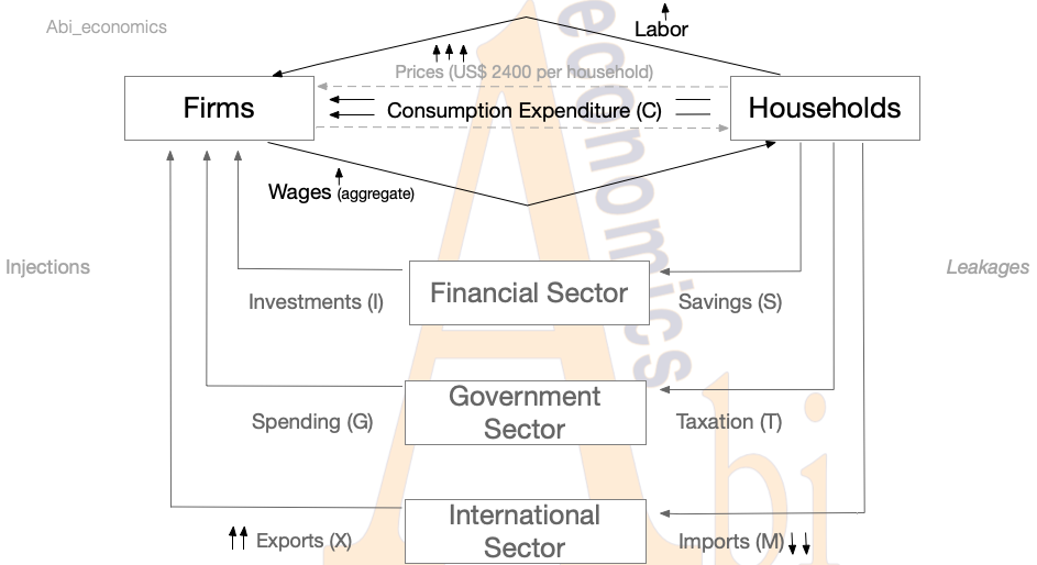 The Circular Flow of Income model (Unit 1, Chapter 1) assists in evaluating the expected impact of U.S. import tariffs on income inequality. The introduction of tariffs will increase the price of goods and services consumed in the U.S. The Yale Budget Lab estimates that prices will rise by US$ 2,400 per U.S. household (based on 1 August tariff levels). Without off-setting wage increases, one may assume that expenditure on goods and services will fall by the same amount. With 128 million U.S. households in 2024, this fall in expenditure would equate to US$ 307 billion per year. Figure 1 presents the effects using the Circular Flow of Income model.