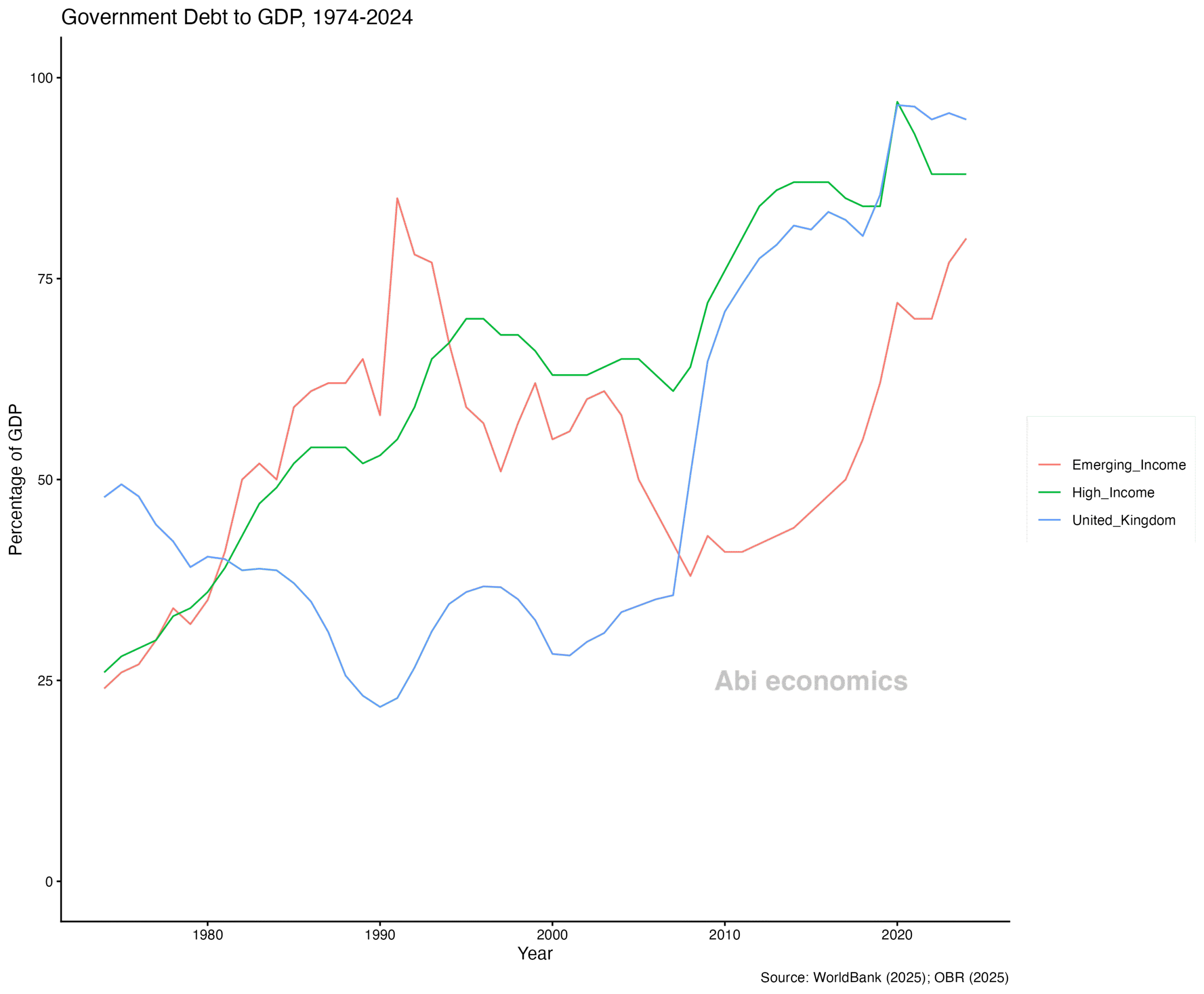 Figure 3 plots the debt levels of high and emerging-income countries, along with the United Kingdom from 1974 to 2024. From the 1980s the United Kingdom had relatively low levels of debt. This changed towards the end of the first decade of the twenty-first century. Since the end of the Covid-19 global pandemic, while other high-income countries have lowered their debt levels, the United Kingdom has not.