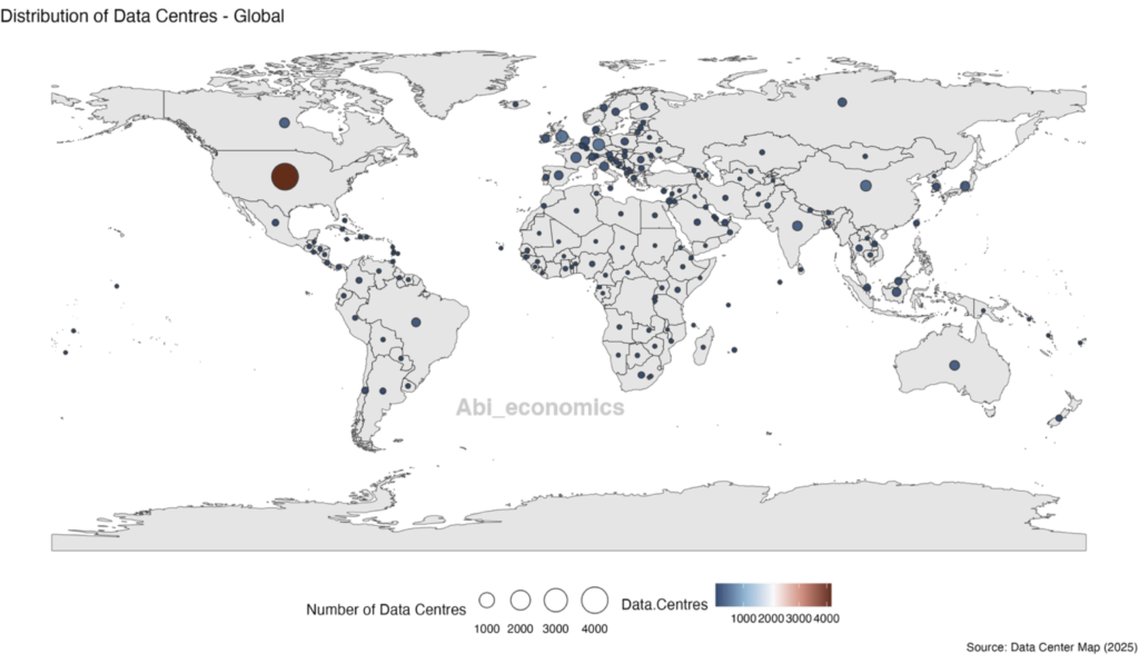 The distribution of data centres is scattered across the globe. However, the Unites States has a particular concentration with 4264 centres (as of 07.12.2025), followed by China (500-600 estimated), United Kingdom (499) and Germany (487) (Data Center Map, 2025). The concentration of data centres in the US is in line with the large investment by US-based firms: Google, Amazon, Microsoft and OpenAI (see Abieconomics blog post). Figure 1 demonstrates the global distribution of data centres, with particular concentrations in the United States and Europe.